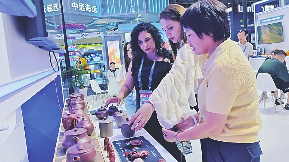 山西展區(qū)內(nèi),國際客商正在挑選產(chǎn)品。山西經(jīng)濟日報記者 宋燁 攝